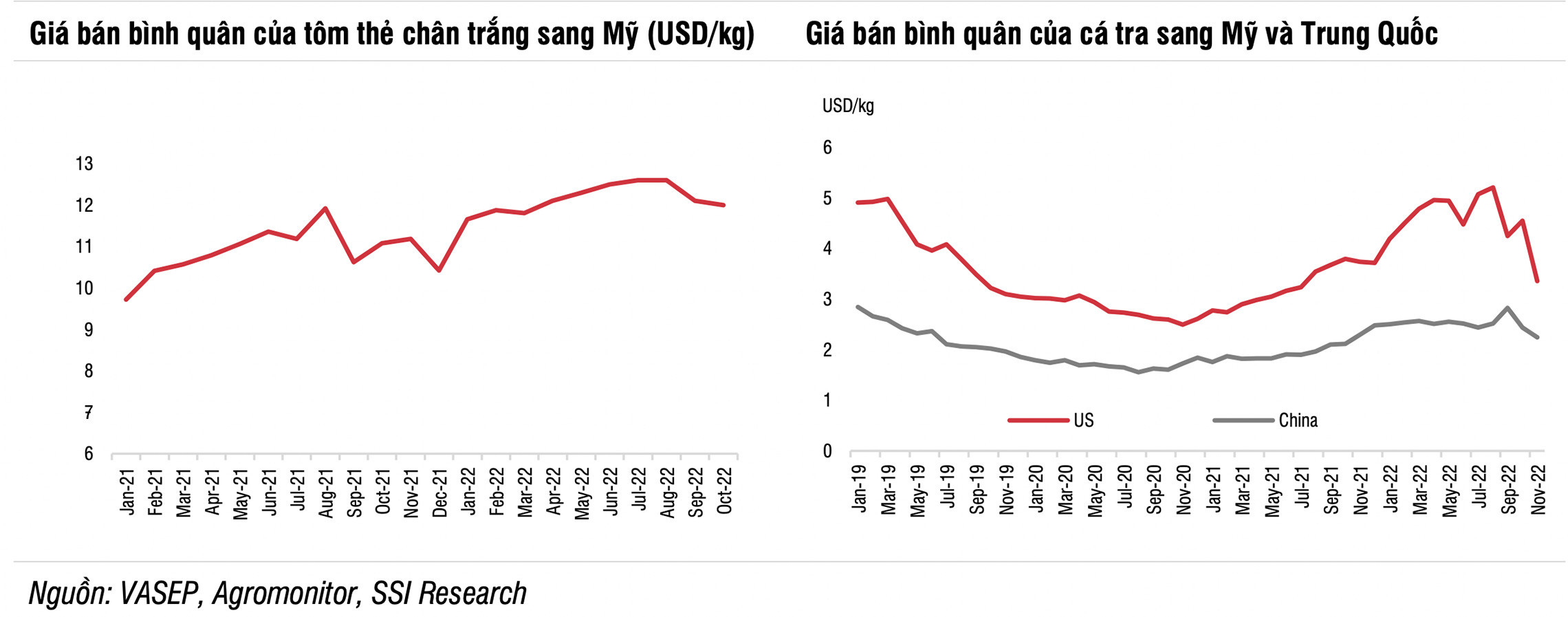 SSI cho rằng, giá bán bình quân mặt hàng thuỷ sản sẽ giảm 20-30% so với cùng kỳ. Với lượng đơn đặt hàng tăng chậm, nguồn cung không thiếu hụt đối với cả tôm và cá nguyên liệu. Đến hết nửa đầu năm 2023, giá nguyên liệu tôm và cá vẫn giảm nhẹ do nhu cầu yếu.