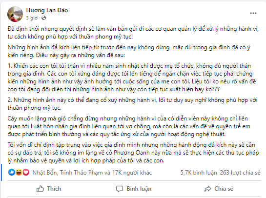 Tôi vốn dĩ chỉ định tập trung vào việc gia đình mình nhưng những hành động đả kích này sẽ cần có sự đáp trả, tôi sẽ không im lặng về cô Phương Oanh này nữa mà sẽ thực hiện các thủ tục pháp lý nhằm bảo vệ quyền và lợi ích hợp pháp của tôi và các con”.