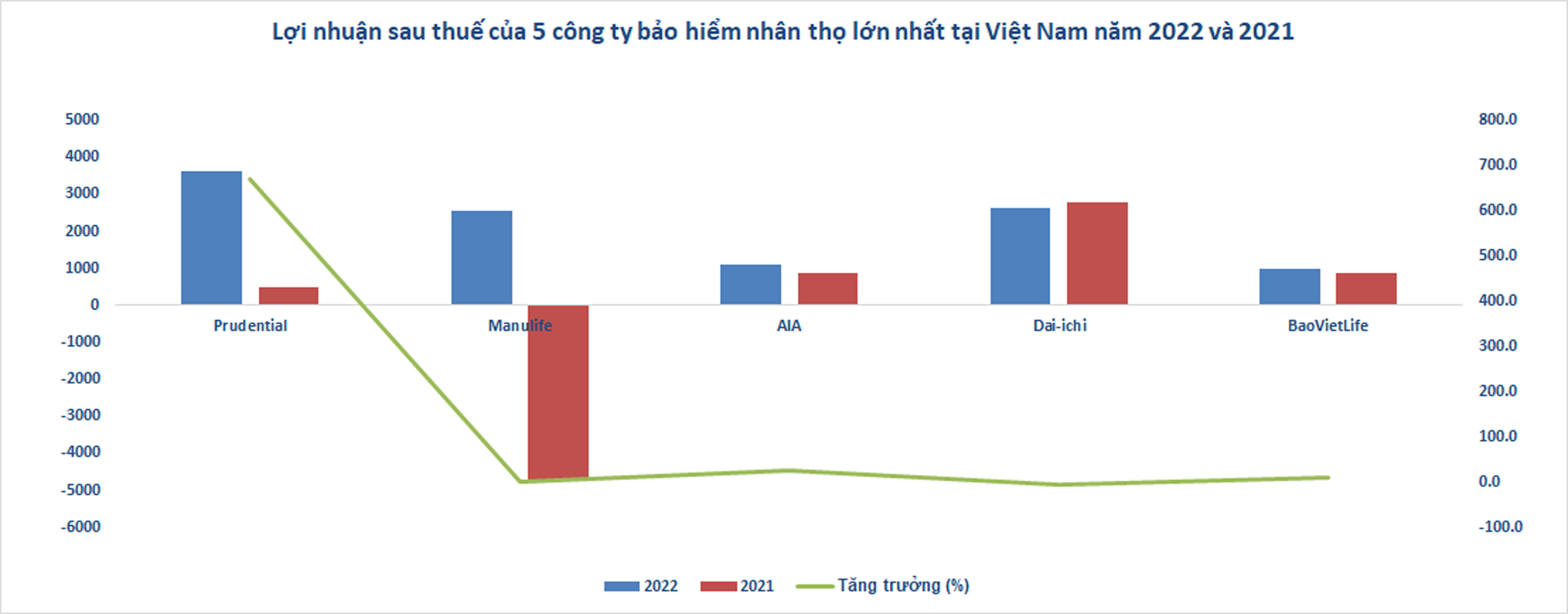 Như vậy, trong năm 2022, Prudential, Manulife có lợi nhuận tăng trưởng đột biến. Trong khi đó, Dai-ichi, Bảo Việt Life và AIA biến động nhẹ so với năm trước.