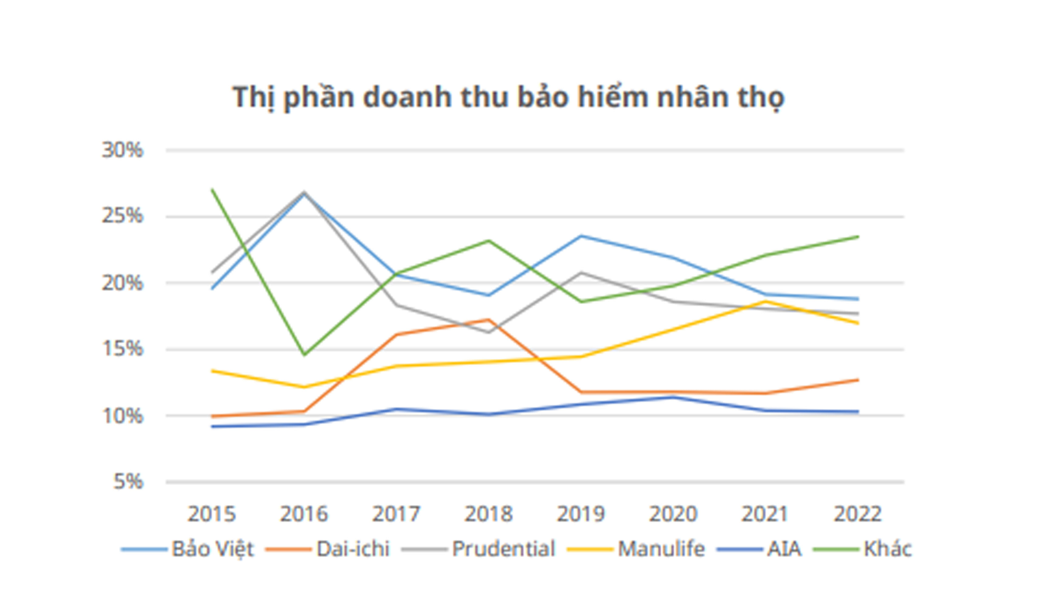 Trong một báo cáo hồi tháng 3, theo Mirae Asset Việt Nam, giai đoạn 2015- 2022, thị phần doanh thu của Top 5 doanh nghiệp bảo hiểm nhân thọ duy trì khá ổn định, bao gồm Bảo Việt Life, Dai-ichi, Prudential, Manulife, AIA. Nhóm này giữ khoảng cách xa so với phần còn lại.
