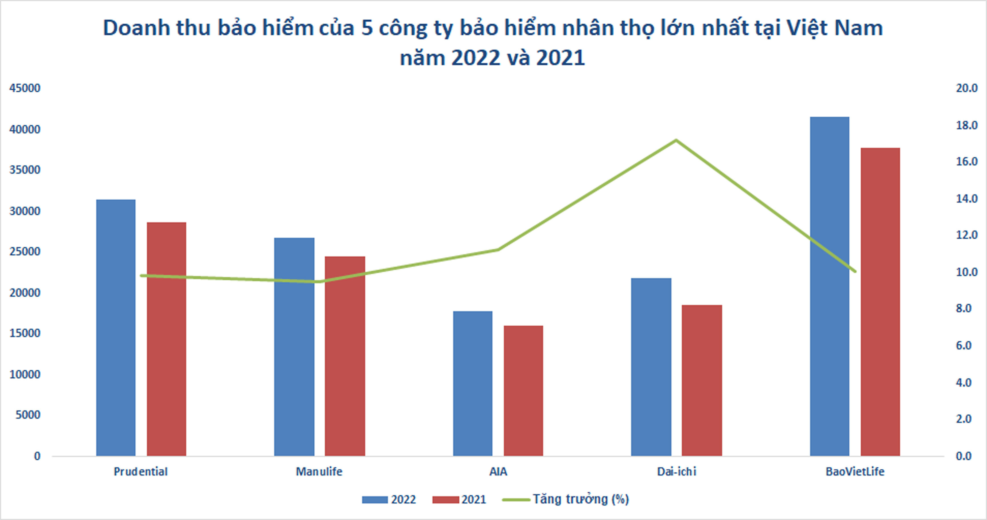 Về tốc độ tăng trưởng doanh thu bảo hiểm trong năm 2022, Dai-ichi Life đứng đầu với 17,2%. AIA tăng 11,3%, trong khi Bảo Việt Life, Prudential và Manulife tăng trưởng lần lượt là 10,1%, 9,8% và 9,5%.