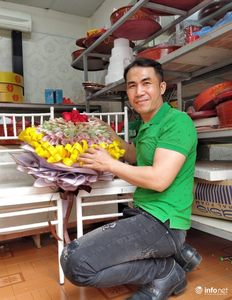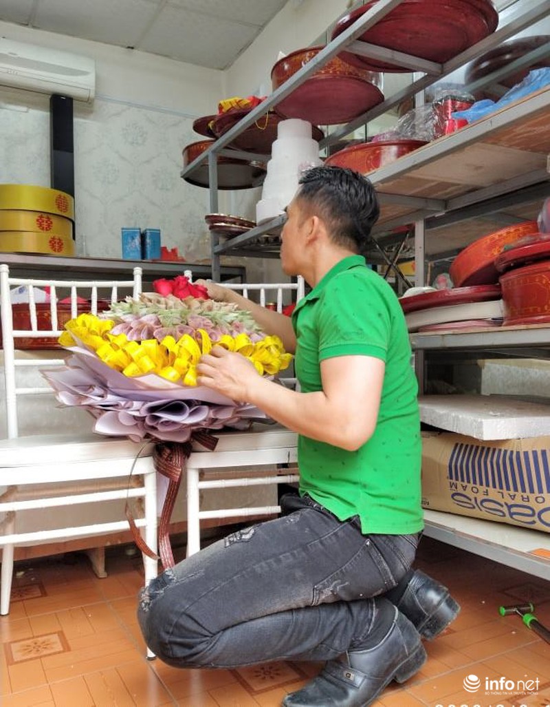 Anh Nguyễn Trường Sơn – chủ một cửa hàng hoa tươi ở chợ Vĩnh Quỳnh (Thanh Trì – Hà Nội) vừa làm xong bó hoa độc đáo do khách hàng đặt. |