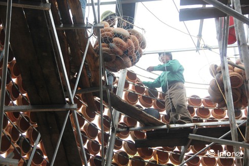 Theo người dân ở đây cho biết, cây thông Noel này có chiều cao khoảng 24m, đường kính 8m. Sau khi hoàn thành khung số nồi đất để hoàn thiện công trình, số nồi sẽ lên tới khoảng 5.000 chiếc. |