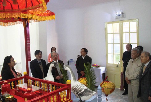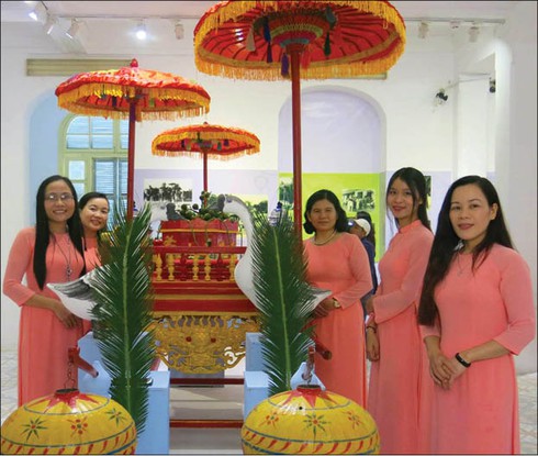 Các nhà nghiên cứu, nhà văn hóa tham quan không gian trưng bày đám cưới truyền thống Huế tại Bảo tàng Văn hóa Huế. Ảnh: Phan Thành |