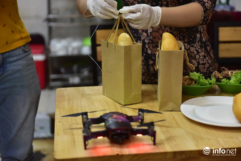 Theo chia sẻ của anh Sơn (chủ quán), ban đầu anh chỉ dùng thiết bị flycam chuyển những đồ ăn nhỏ nhẹ như bánh mì, sau đó thấy ổn nên anh tiếp tục cho chuyển cả rau ra phục vụ khách hàng.