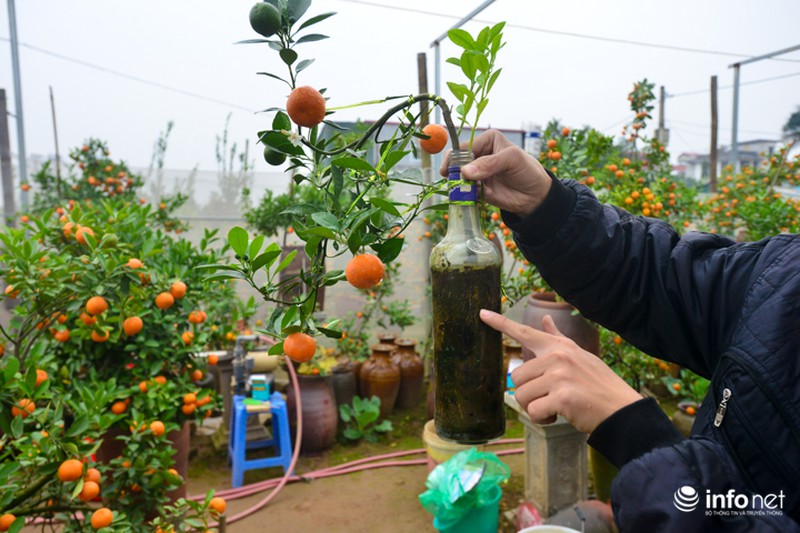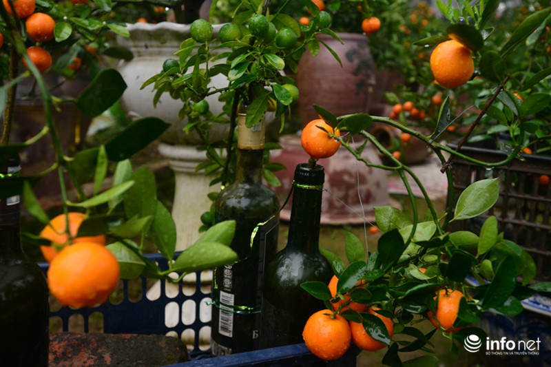 Điều đặc biệt, những chai quất này đều được trồng từ một cây nguyên chứ không phải cắt hay giâm cành. Vì vậy, trước khi trồng phải chọn những cây quất giống nhỏ, thân cây vừa với cổ chai thủy tinh. |