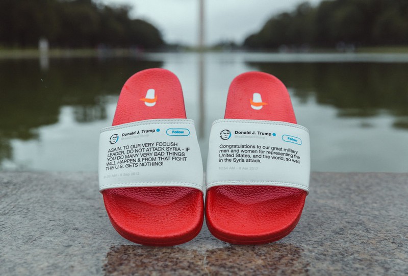 Đôi dép xỏ ngón "Phiên bản Syria". Dép phải là dòng Tweet Tổng thống Mỹ Donald Trump đăng năm 2013 ngăn ông Barrack Obama không nên tấn công Syria. Dép trái là dòng Tweet Tổng thống Mỹ Donald Trump đăng tháng 4/2017 khi ông ra lệnh tấn công Syria. |