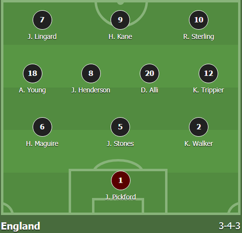 Đội hình ra sân dự kiến: 3-4-3, gồm: Jesse Lingard, Harry Kane, Raheem Sterling; Ashley Young, Jordan Henderson, Dele Alli, Kieran Trippier; Harry Maguire, John Stones, Kyle Walker.