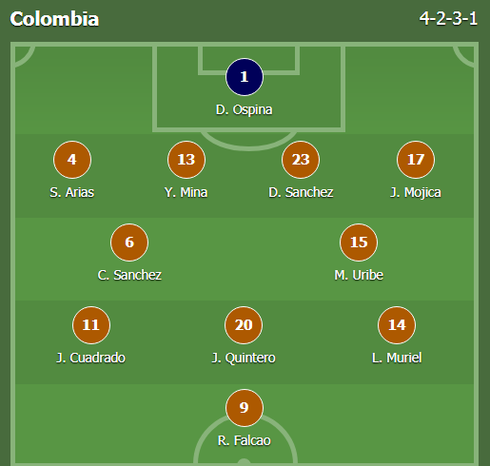 Đội hình ra sân dự kiến: 4-2-3-1, gồm: Santiago Arias, Yerry Mina, Davinson Sanchez, Johan Mojica; Carlos Sanchez, Mateus Uribe; Juan Cuadrado, Juan Quintero, Luis Muriel; Radamel Falcao.
