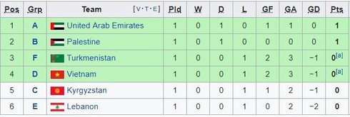 Dưới đây là bảng xếp hạng Asian Cup 2019: