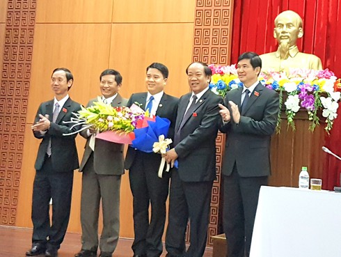 Tân Phó Chủ tịch UBND tỉnh Quảng Nam Trần Văn Tân (giữa) nhận hoa chúc mừng từ lãnh đạo tỉnh |