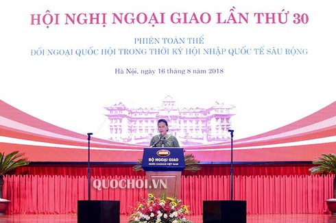 Phát biểu tại Hội nghị, Chủ tịch Quốc hội Nguyễn Thị Kim Ngân đánh giá cao việc Hội nghị Ngoại giao 30 đã tổ chức phiên họp chủ đề “Đối ngoại Quốc hội trong thời kỳ hội nhập quốc tế sâu rộng” để trao đổi về hoạt động đối ngoại Quốc hội, khẳng định vai trò của đối ngoại quốc hội trong nền ngoại giao Việt Nam và những đóng góp tích cực, hiệu quả của đối ngoại Quốc hội trong sự nghiệp chung của đất nước. Chủ tịch Quốc hội biểu dương những đóng góp của ngành ngoại giao đối với sự nghiệp xây dựng và bảo vệ Tổ quốc, nhấn mạnh ngành ngoại giao đã quán triệt đường lối đối ngoại của Đại hội Đảng lần thứ XII, kiên trì về nguyên tắc, kiên định về mục tiêu, chủ động và linh hoạt trong triển khai và đạt được nhiều kết quả quan trọng.