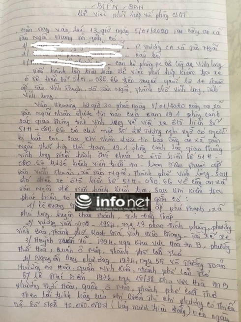 Qua kiểm tra trên xe có 5 người gồm: Lê Hoàng Giang (sinh năm 1988, ngụ Đồng Tháp), tài xế Vương Tấn Đạt (sinh năm 1984, ngụ Kiên Giang), Huỳnh Tuấn Vũ (sinh năm 1994), N.D.P. (sinh năm 1974) và Lê Trúc Diễm (sinh năm 1976, cùng ngụ TP Cần Thơ).