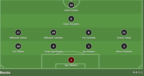 Đội hình thi đấu của đội tuyển Nga trong trận Nga vs Uruguay ở loạt trận cuối cùng trong khuôn khổ vòng đấu bảng A vào lúc 21h tối nay 25/6 dự kiến là: 4-4-1-1.