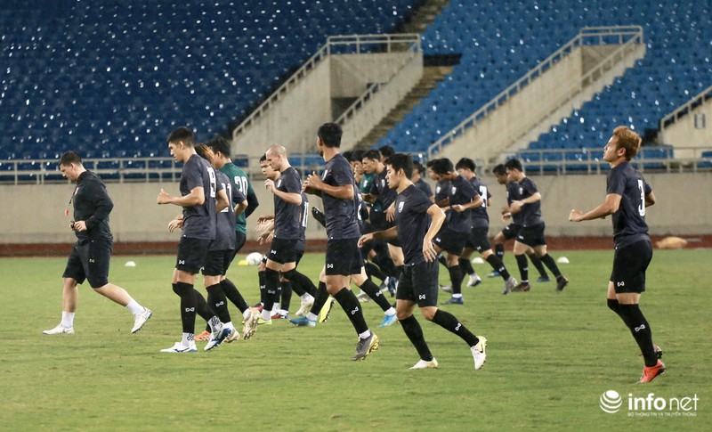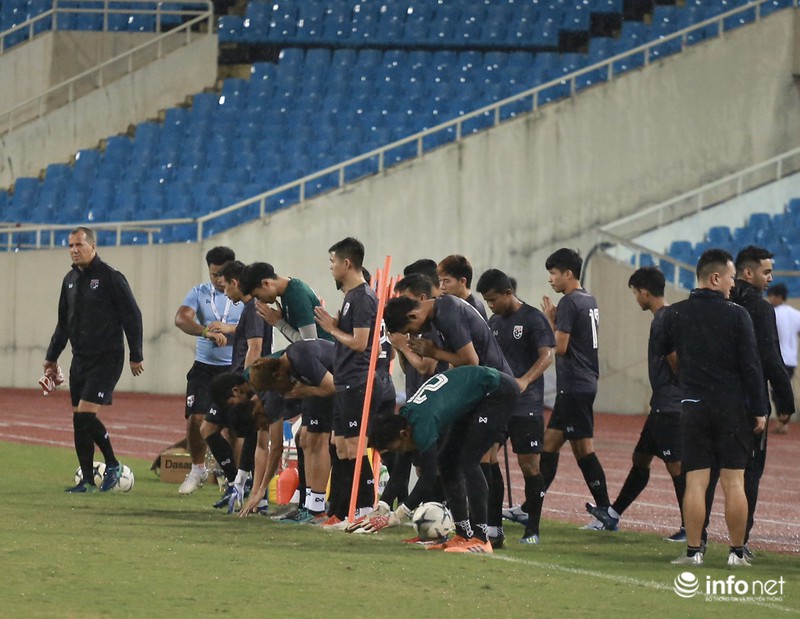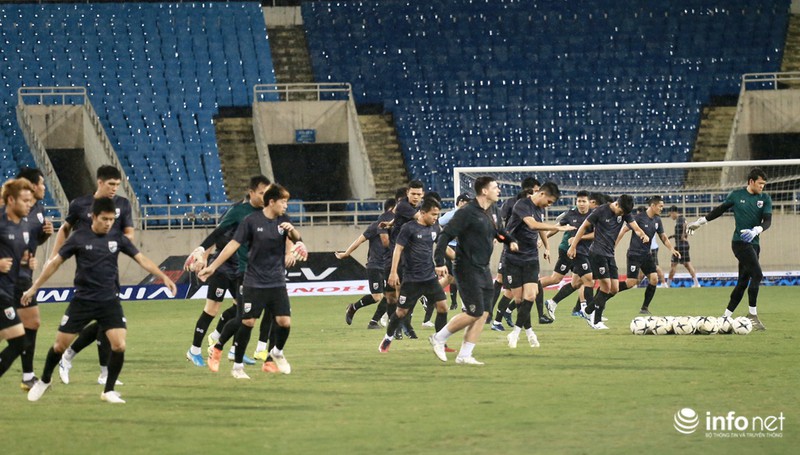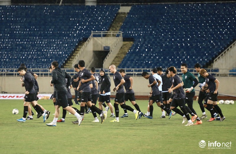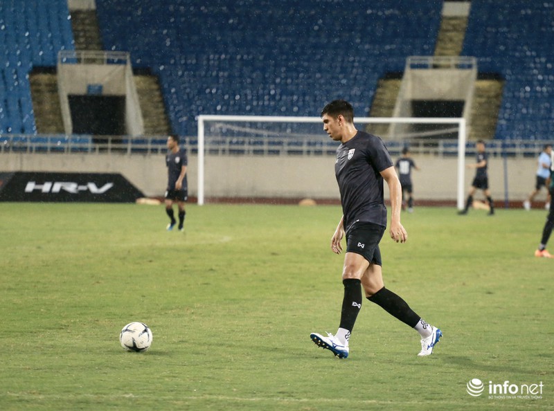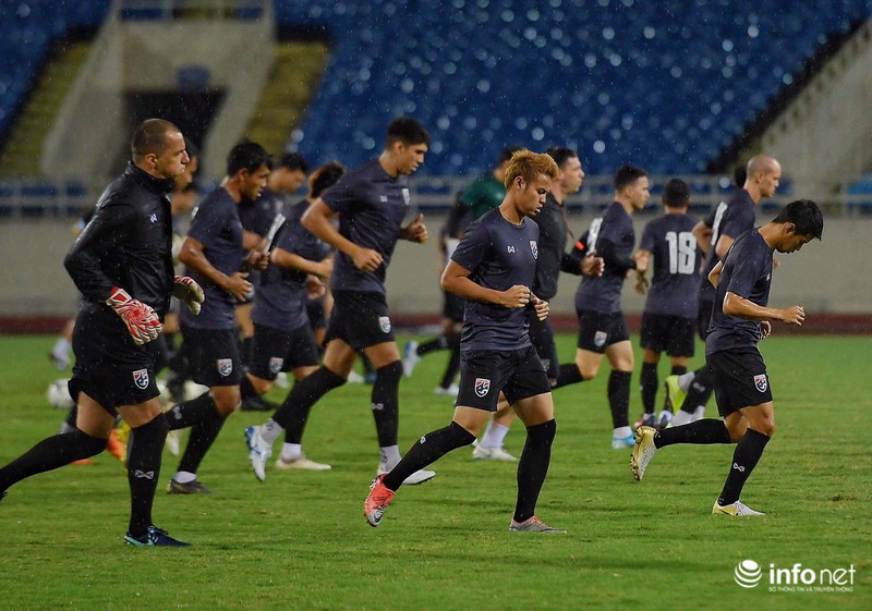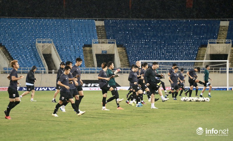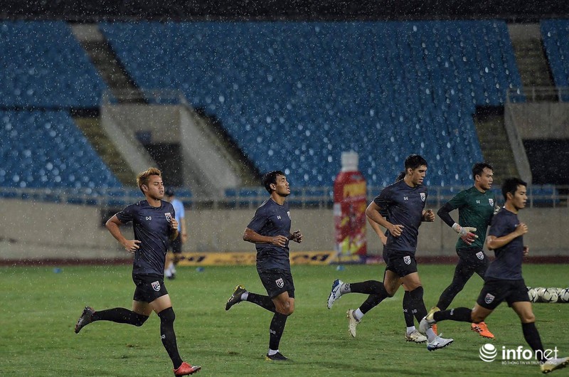 Điều này cho thấy đội tuyển Thái Lan rất chú trọng trận đấu ngày mai, dù tập dưới cơn mưa nặng hạt nhưng các học trò của ôngHLV Akira Nishino tập trung từng động tác.