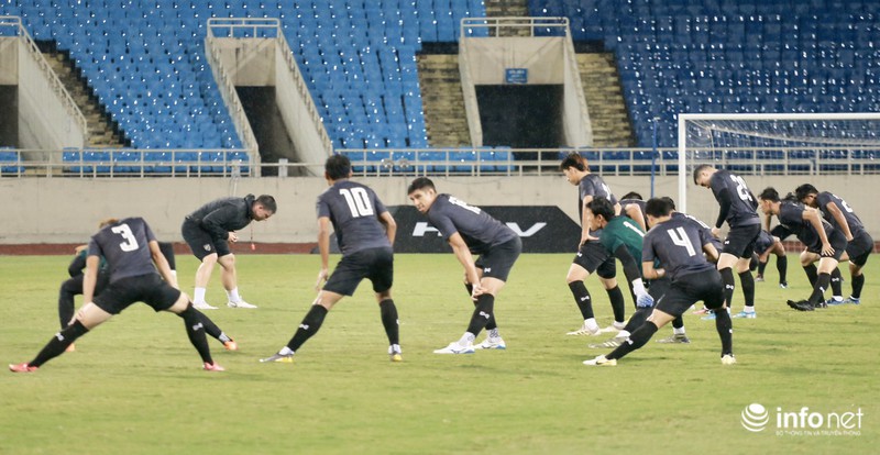 Vào chiều tối 18/11, HLV đội tuyển Thái Lan ông Akira Nishino cùng các học trò của mình đã có buổi tập làm quen sân Mỹ Đình dưới trời mưa lớn, trước khi đối đầu tuyển Việt Nam tại Vòng loại thứ hai World Cup 2022 vào ngày mai.