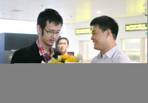 Đón đoàn tại sây bay quốc tế Nội Bài có ông Sái Công Hồng- Phó cục trưởng Cục Quản lý chất lượng (Bộ GD&ĐT), lãnh đạo các Sở GD&ĐT, lãnh đạo các nhà trường có học sinh dự thi cùng đông đảo người thân, thầy cô, bạn bè của các em.