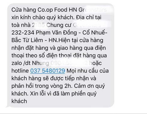 Nhân viên tại cửa hàng Co.op Food nằm trong một khu chung cư ở đường Phạm Văn Đồng (Hà Nội) cho biết, từ ngày 18/3, cửa hàng đã gửi tin nhắn đến toàn bộ khách hàng để thông báo số điện thoại hotline, nhận đặt hàng, giao hàng qua điện thoại.