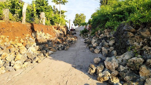 Gạch đá rơi ngổn ngang trên các con đường của huyện. |