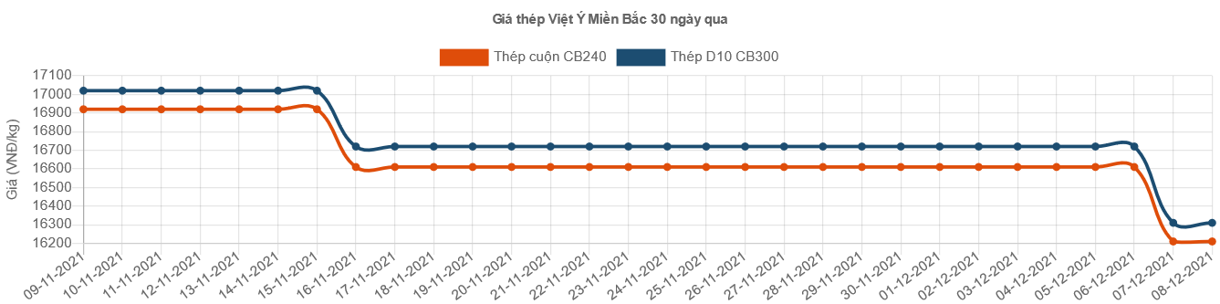 Tại thị trường miền Nam, giá thép được điều chỉnh giảm sâu tới 450 đồng/kg, hiện hai sản phẩm của hãng là thép cuộn CB240 ở mức 15.960 đồng/kg và thép thanh vằn D10 CB300 có giá 16.060 đồng/kg.