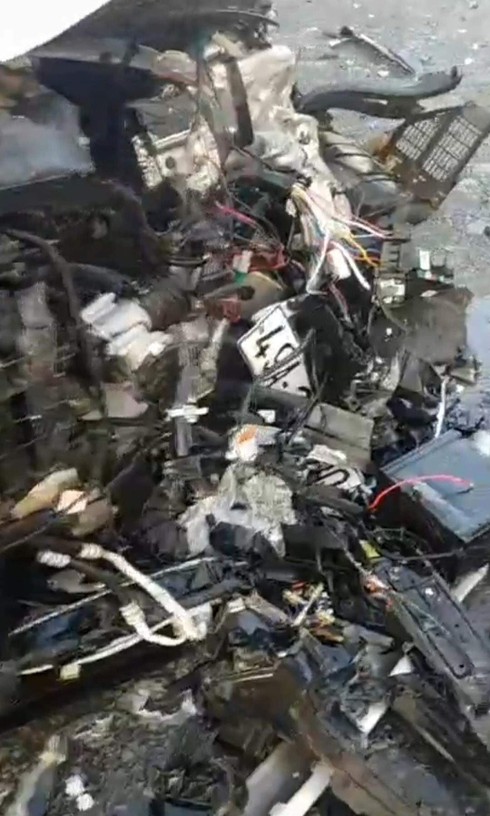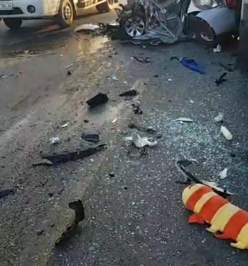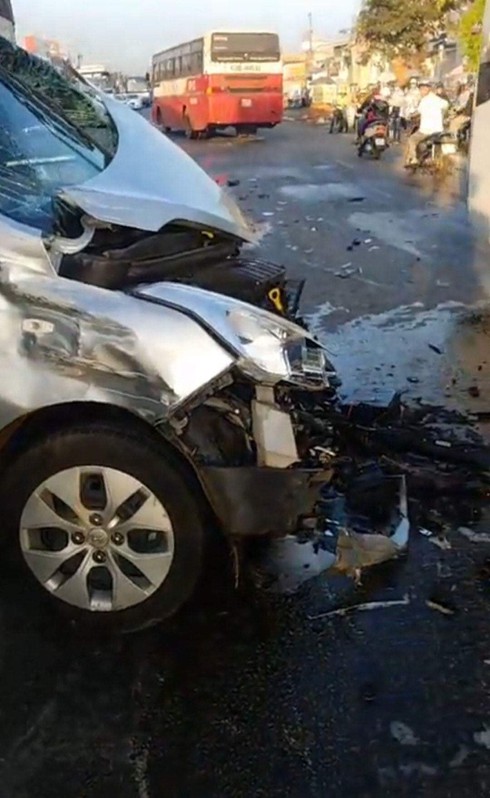 Bị tông mạnh chiếc xe taxi xoay lạc tay lái sang làn đường đối diện. Đúng lúc này, xe tải BKS: 85C -028.51 đi ngược về Long Khánh đã tông thẳng vào đuôi của xe taxi vừa bị xe tải kia tông xoay qua và cuốn vào gầm, bị bẹp dúm phần sau...