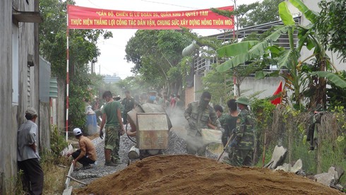 | Cán bộ, chiến sỹ của Lữ đoàn Công binh 25 và Lữ đoàn Tăng thiết giáp 26 xây dựng đường làng cho người dân |