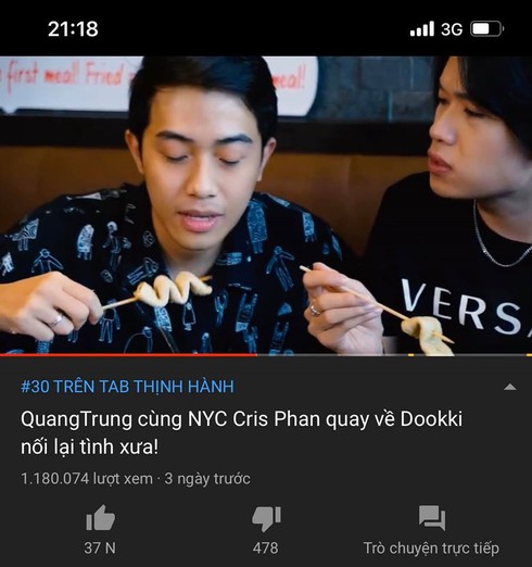 Quang Trung khoe thành tích của video quay chung với Cris Phan đi ăn uống đã đạt được 1 triệu 200 lượt xem chỉ sau ba ngày. Nhờ thành tích đó mà Quang Trung đã phá kỷ lục của bản thân mình là bốn ngày 1 triệu view. |
