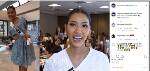 Hoàng Thùy“vòng hai hay tay chạm rốn” và nhảy nhót trong một đoạn video hài hước khiến nhiều người thích thú. Người đẹp thường xuyên cập nhật trạng thái của cá nhân và những khoảnh khắc cùng các thí sinh khác trên Instagram của mình. Vừa mới đây Hoàng Thùy có màn nói tiếng Anh như gió được đăng riêng trên fanpageMiss Universe. Điều đó cũng giúp cô khẳng định tâm thế tự tin bước vào cuộc thi. |