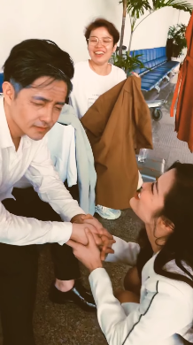 Sau khi Ông Cao Thắng hóa trang xong, Đông Nhi đã tiến đến ngồi sụp xuống nắm tay nhưng không quên trêu chọc người yêu: “Hồi nãy câu chuyện anh ho, tụi nó đem ra ngoài làm trò cười. Tụi nó nói anh make up già mà anh ho một cái, nó y xì đúc. Anh thấy mặt anh chưa?”.