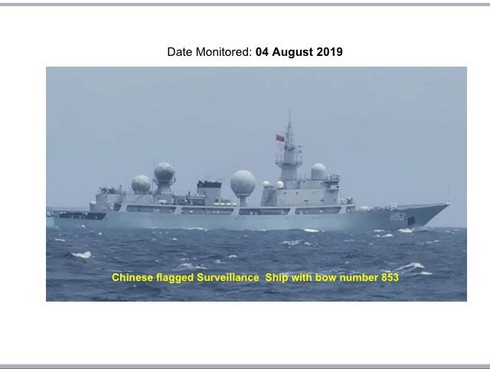 Tàu mang số hiệu853 của Trung Quốc xuất hiện trong vùng biển của Philippines. (Ảnh: Bộ Tư lệnh Tây Mindanao) |