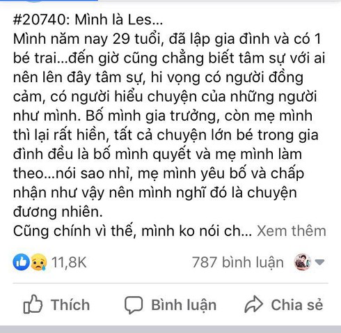 Ngay sau khi tâm sự của cô gái xuất hiện trên mạng xã hội, bài viết đã nhận được hàng nghìn lượt like và bình luận. Nhiều người cho rằng, cô gái nên sống thật với giới tính của mình vì không ai sống thay cô cả đời. Nhưng số khác lại khuyên cô nên nghĩ cho con cái và gia đình thay vì sống ích kỉ cho bản thân.