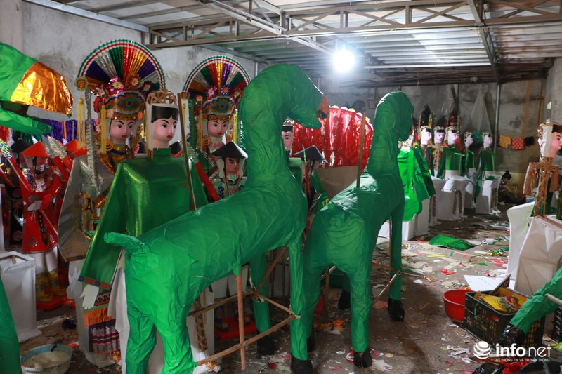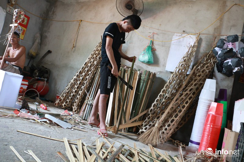 Trong khi đó, để làm ra một hình nộm phải trải qua rất nhiều công đoạn mà công việc đầu tiên là tạo dáng từ khuôn tre. Nhiều hộ trong làng đã phải đi mua tre từ các nơi cả tháng trước. Sau đó người thợ mới dán giấy bồi, trang trí...