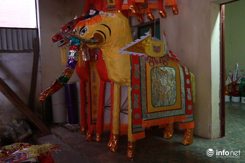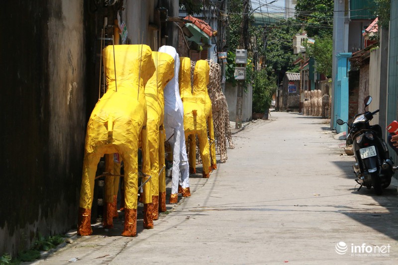 Theo ghi nhận của PV, ngay từ đường vào làng, các hình nộm vàng mã như, ngựa, voi, xe... được xếp đầy thành từng hàng dọc các con đường, ngõ xóm khắp trong làng.