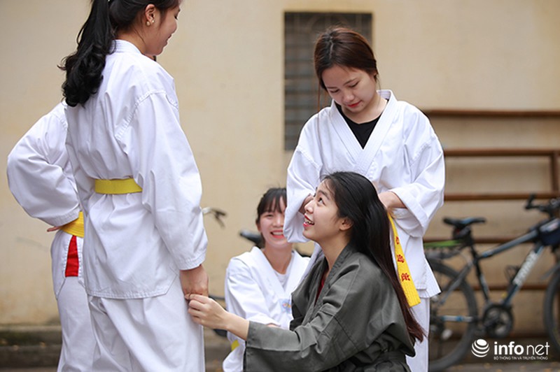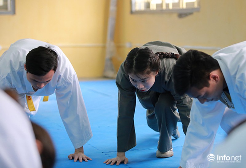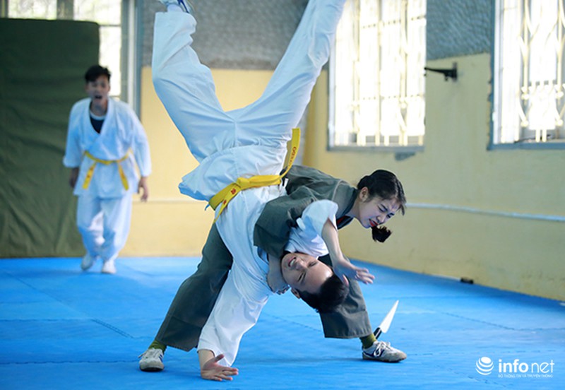 Hoài Thương cho biết, trước khi tập võ thuật công an, cô đã có thời gian dài trước đó tậptaekwondo nên đã thích nghi khá nhanh với môi trường huấn luyện võ thuật trong trường. |