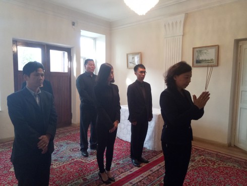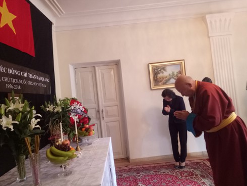 Đại sứ Đoàn Thị Hương và cán bộ, nhân viên ĐSQ đã kính cẩn thắp hương trước di ảnh của Chủ tịch nước Trần Đại Quang. Đại sứ đã ôn lại tiểu sử cùng những đóng góp to lớn của Chủ tịch nước Trần Đại Quang đối với công cuộc phát triển kinh tế và thúc đẩy hội nhập quốc tế của Việt Nam.