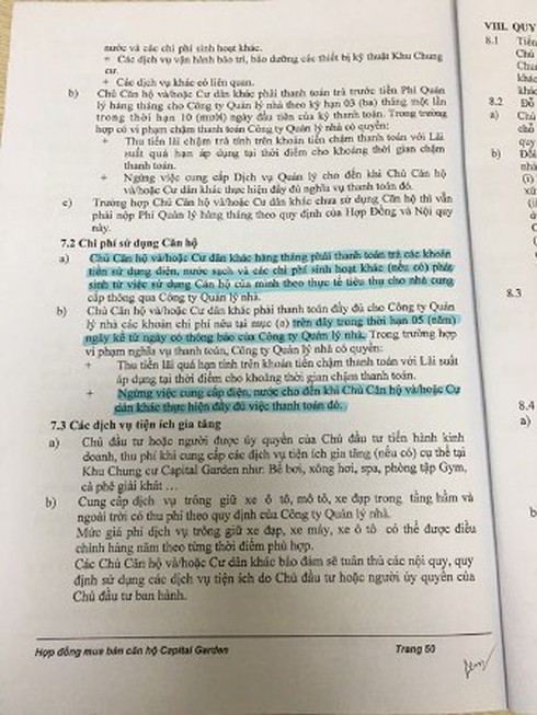 Tại mục 7.2 phụ lục 05 của Hợp đồng mua bán căn hộ đã nêu rất rõ: “Chủ căn hộ hoặc cư dân khác hàng tháng phải thanh toán các khoản tiền sử dụng điện, nước sạch và các chi phí khác phát sinh (nếu có) từ việc sử dụng căn hộ của mình theo thực tế tiêu thụ cho nhà cung cấp thông qua Công ty quản lý nhà. Trong thời hạn 05 ngày kể từ ngày có thông báo của Công ty quản lý nhà, nếu chủ căn hộ hoặc cư dân khác vi phạm nghĩa vụ thanh toán, Công ty quản lý nhà có quyền: