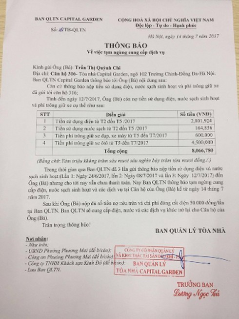 Trước khi thực hiện việc ngừng cấp điện, nước, BQL tòa nhà đã gửi thông báo nêu rõ lý do và thời gian cắt điện đến cho từng hộ.