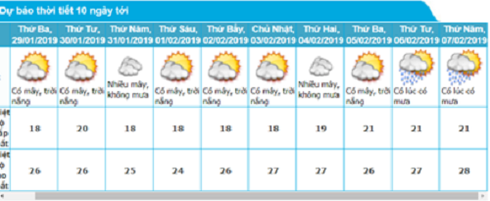 Bản tin dự báo thời tiết Tết Nguyên đán 2019 (từ ngày 04 đến ngày 11/02/2019 – tức ngày 30 Tết đến ngày 07 Tết) của TT DBKTTV TƯ cho biết: