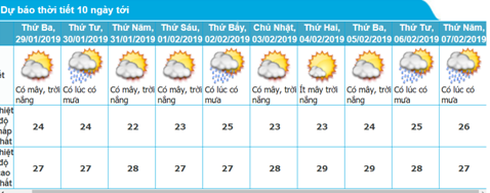 Từ ngày 04/02 đến ngày 10/2, có mưa vài nơi, sáng sớm có sương mù và sương mù nhẹ rải rác, trưa chiều trời nắng. Từ đêm 10 đến ngày 11/2 có mưa, mưa rào và có nơi có dông.