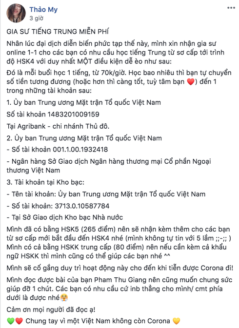 Mình đọc được bài đăng bên 1 nhóm học tiếng Trung (Hội Lưu học sinh Việt Nam tại Trung Quốc) thấy ý tưởng hay quá nên muốn góp chút sức mọn giúp đỡ Tổ Quốc. Mình cũng rất xin lỗi vì tần suất up bài hơi nhiều có điều các group học tiếng Đức hầu hết là do 1 trung tâm tạo ra nên vào đó kêu dạy miễn phí thì lại không hay lắm nên mới xin phép đăng trong nhóm mình cho những bạn nào cũng đang vất vả vì tiếng Đức ạ" - Du học sinh Phạm Thu Giang chia sẻ.