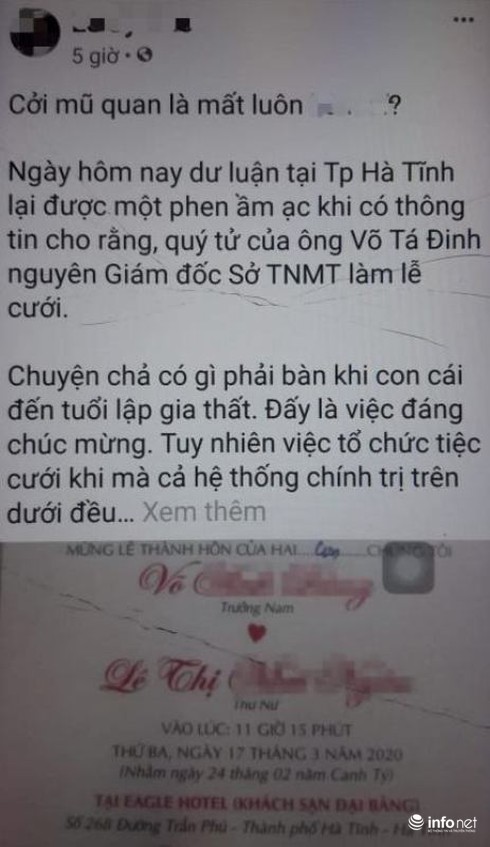 Sau khi PV đặt vấn đề về đám cưới trong mùa đại dịch, nguyên Giám đốc Sở TN&MT Hà Tĩnh Võ Tá Đinh cười, cho biết: “Có việc gì đâu. Việc gia đình mà. Chỉ nội thông gia hai gia đình và hai họ thôi”.