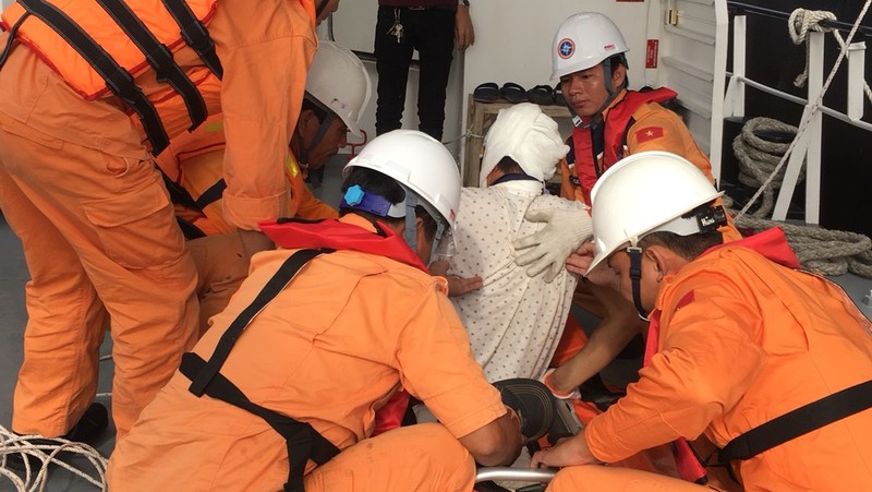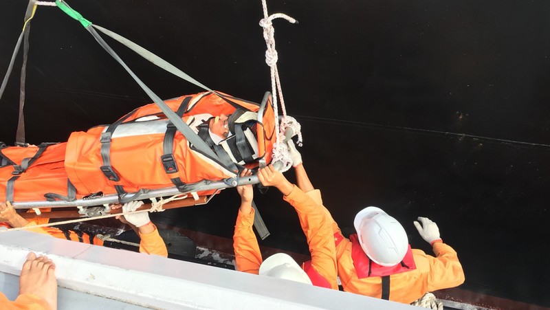 Qua xác minh, nguyên nhân dẫn đến chấn thương của hai thuyền viên Zhang Li Jin (quốc tịch Trung Quốc) và Tun Tun Oo (quốc tịch Myanmar) là do bị ngã khi làm việc trong sóng gió, biển động. Trong ảnh các thuyền viên bị thương đã được chuyển xuống tàu cứu hộ an toàn. |
