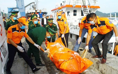 Thi thể các ngư dân tìm thấy được đưa lên bờ để lấy mẫu xét nghiệm ADN, nhận dạng danh tính. |