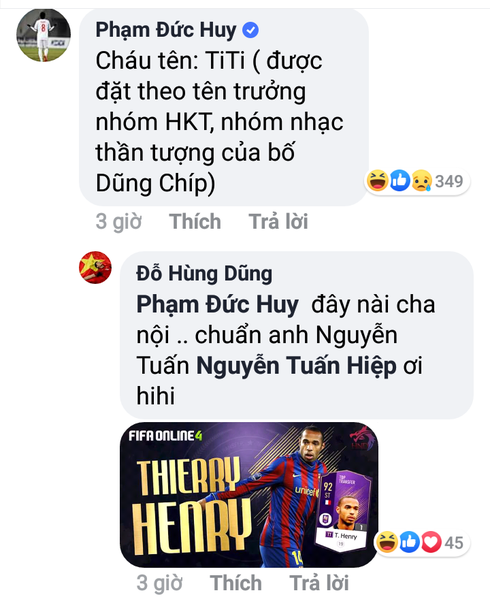 "Huyền thoại trong lòng Dũng Chíp - người mang cảm hứng để đặt tên cho đứa con đầu lòng của Dũng Chíp", kèm với bình luận này Đức Huy đăng thêm hình ảnh của anh chàng TiTi để chứng tỏ lập luận của mình có "cơ sở". Độ "mặn" của Đức Huy chưa bao giờ khiến fan thất vọng, mỗi lần đồng đội đăng status thì y như rằng anh chàng xuất hiện để "cà khịa" mua vui thế này đây.