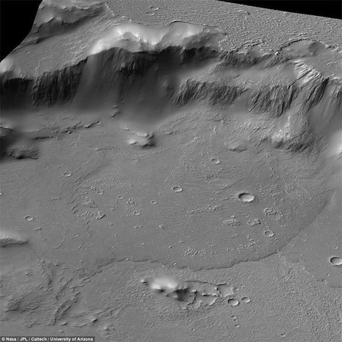 Các nhà khoa học cho biết những lớp dung nham ở sao Hỏa khi dâng lên có thể làm vành đai núi lửa tách biệt chúng ra thành 3, 4 tầng. Bức ảnh được chụp ở vành đai phía bắc, nơi có một miệng núi lửa rộng 30km - (Ảnh: NASA). |