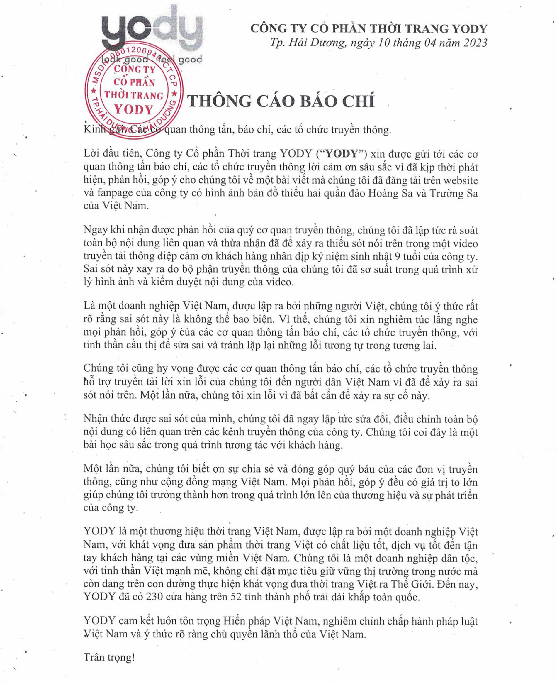 Sáng nay (10/4), YODY đã gửi xin lỗi và cho biết đã lập tức rà soát toàn bộ nội dung liên quan và thừa nhận đã để xảy ra thiếu sót nói trên.