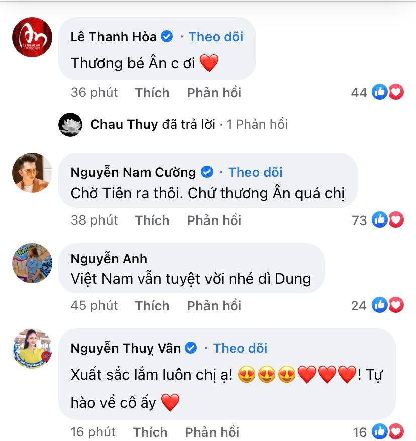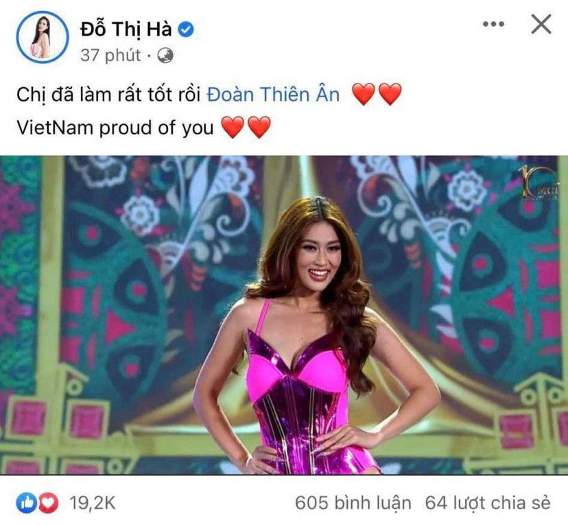 Á hậu Thụy Vân, Hoa hậu Đỗ Thị Hà, Hoa hậu Huỳnh Nguyễn Mai Phương, Lona Kiều Loan,... cũng dành những lời động viên đến Đoàn Thiên Ân, bởi ai nấy đều tự hào, ngưỡng mộ trước 1 cô gái Việt Nam có quãng thời gian ngắn chuẩn bị nhưng đã để lại dấu ấn tại cuộc thi quốc tế.