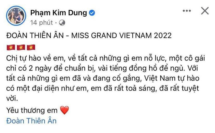 “Bà trùm Hoa hậu” Phạm Kim Dung bày tỏ: “Chị tự hào về em, về tất cả những gì em nỗ lực, một cô gái chỉ có 2 ngày để chuẩn bị, vài tiếng đồng hồ để ngủ. Với tất cả những gì em đã và đang cố gắng, Việt Nam tự hào có một đại diện như em, em đã rất tỏa sáng, đã rất tuyệt vời. Yêu thương em!”.