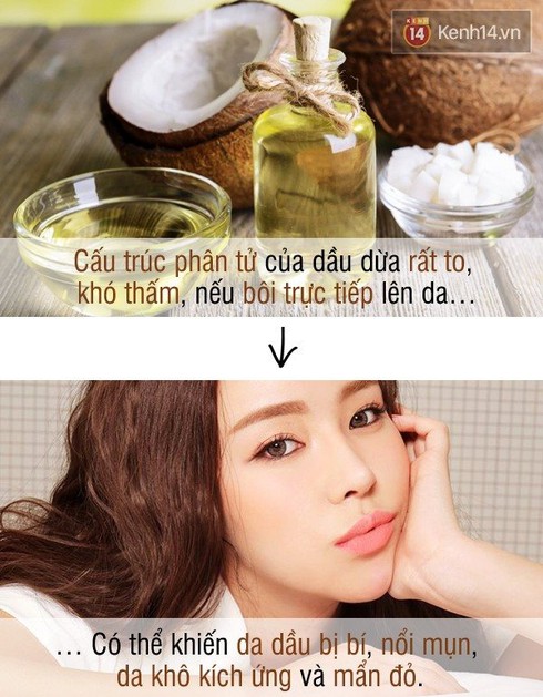 Vì cấu trúc phân tử của dầu dừa to nên rất khó thẩm thấu vào da. Vì thế, nếu bôi trực tiếp lên da sẽ khiến da bị hầm, bí, tắc nghẽn lỗ chân lông. Lâu dài sẽ làm lỗ chân lông nở rộng, tăng tiết bã nhờn và dễ sinh mụn.