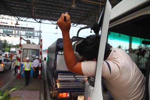 Một tài xế dùng tiền lẻ mua vé khi đi qua trạm thu phí |